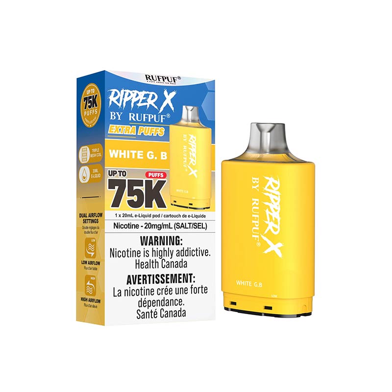 Introducing the massive Ripper X 75K Pod by Rufpuf – designed to seamlessly pair with the Ripper X Ultra Battery (Sold separately). Experience up to 75,000 puffs, an impressive 20mL capacity of exquisitely crafted and delicious Rufpuf salt juice, a dual mesh coil for enhanced flavour, and a dual airflow system.
